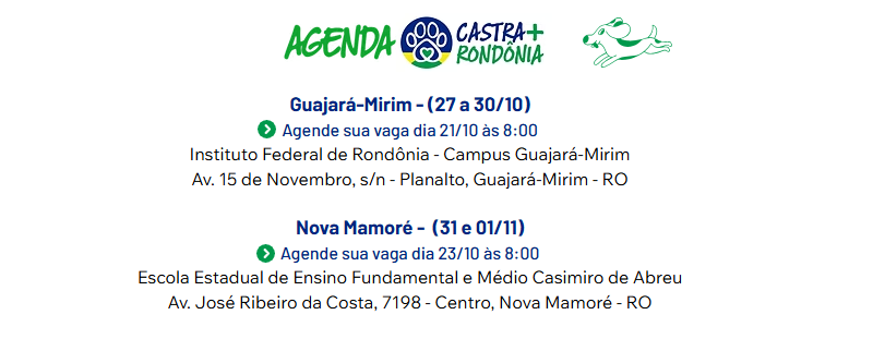 O agendamento online é obrigatório e deve ser feito pelo site www.castramaisrondonia.com.br. As inscrições abrem no dia 21 de outubro às 8h para Guajará-Mirim e 23 de outubro às 8h para Nova Mamoré. As vagas são limitadas.