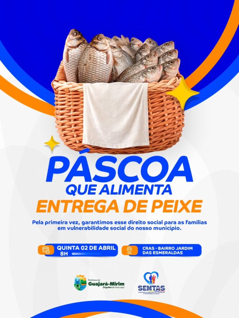 A Prefeitura de Guajará-Mirim, por meio da Secretaria Municipal de Trabalho e Assistência Social (SEMTAS), promoverá no dia 02 de abril de 2026, a partir das 8h, a distribuição gratuita de peixe para famílias em situação de vulnerabilidade social no município.