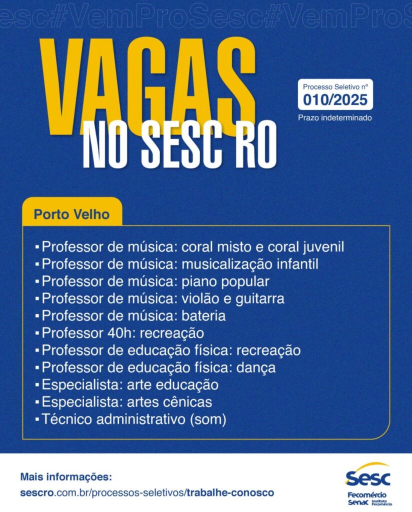O Serviço Social do Comércio em Rondônia (SESC-RO) abriu inscrições para um novo processo seletivo com oportunidades para profissionais de níveis médio, técnico e superior.