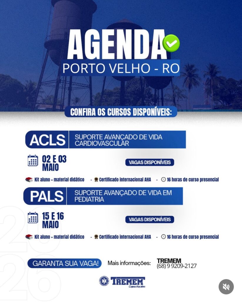 Entre os destaques está o ACLS (Suporte Avançado de Vida Cardiovascular), que acontece nos dias 02 e 03 de maio, voltado para manejo de situações críticas cardíacas. Já nos dias 15 e 16 de maio, é a vez do PALS (Suporte Avançado de Vida em Pediatria), essencial para quem atua com o público infantil.